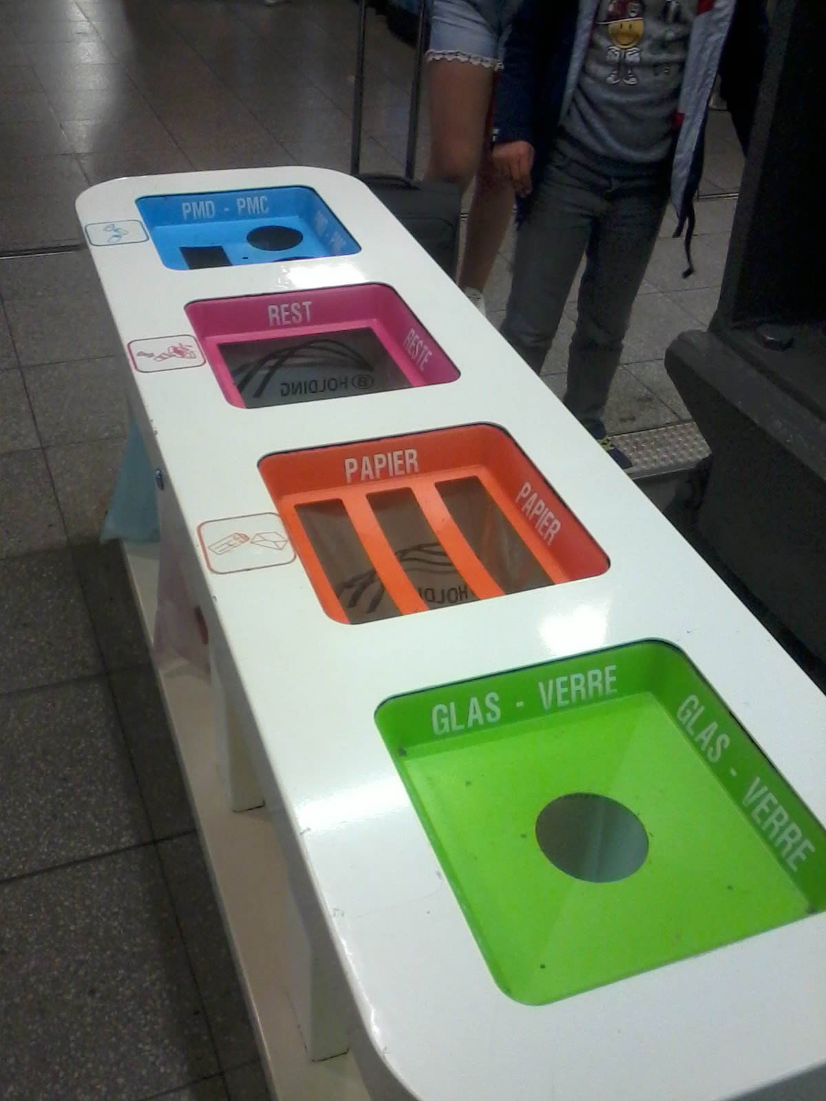 Il y a des corbeilles communales, départementales mais aussi des corbeilles de parc d’attractions, de gares, de station services, de centres commerciaux, de parcs zoologiques et autres lieux de passage où il n’y a également aucun tri alors que des millions de visiteurs qui trient chez eux passent et jettent des millions de déchets. Ces corbeilles permettent au moins de ne pas jeter par terre ces détritus. Et encore ! Certains le font en justifiant leur acte par le manque de corbeilles[9]. Le nudge peut aider comme au Danemark avec des traces de pas vers les corbeilles. Des traces de pas associées à une signalétique représentant les corbeilles de propreté sembleraient plus évidentes pour les passants.