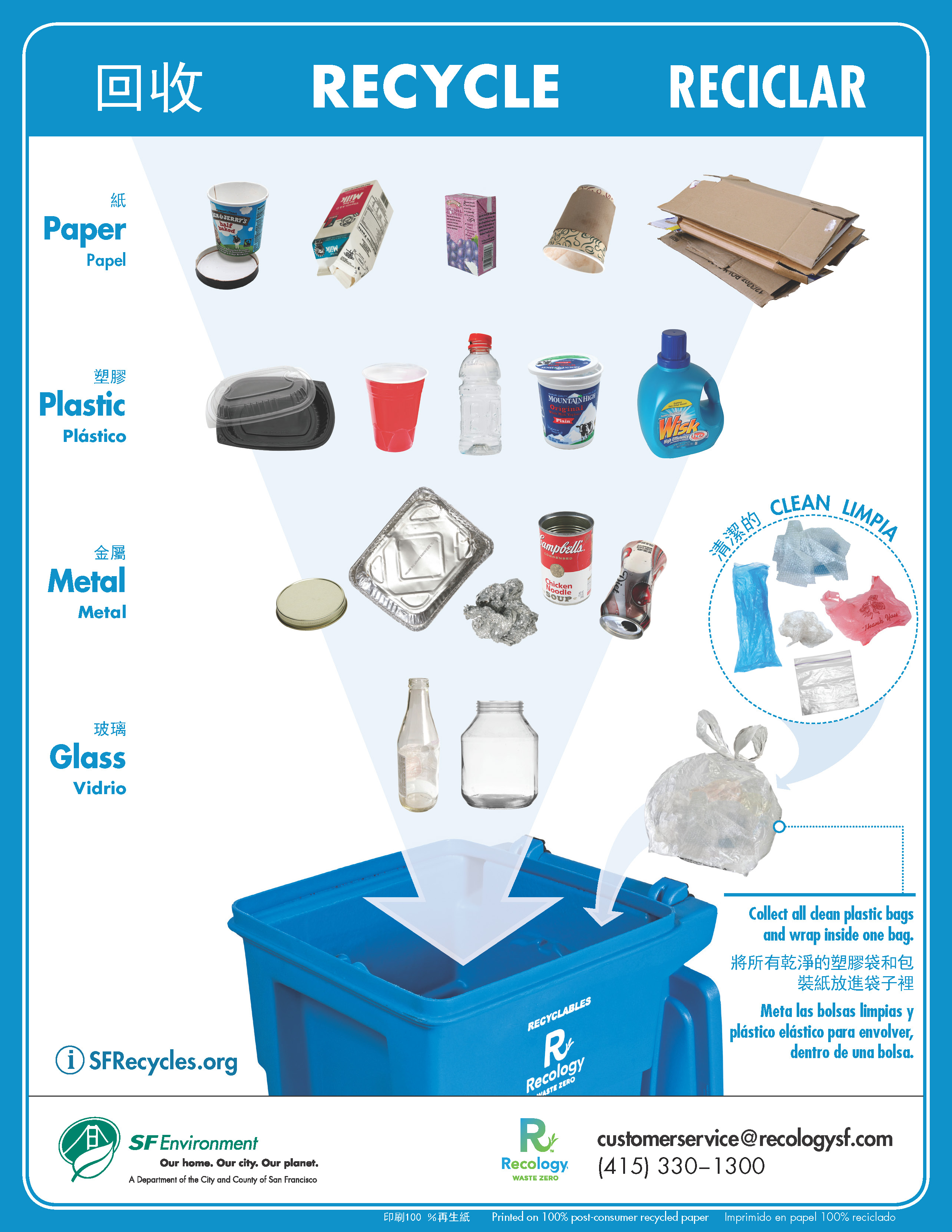 La communication n’est souvent visible qu’au dernier moment. Or qui s’embêterait à tout lire pour savoir où jeter son emballage ? Une communication visible de loin en hauteur mais également sur la corbeille permettrait un meilleur tri. San Francisco a développé une communication multilingue pour ses poubelles.